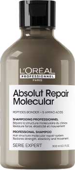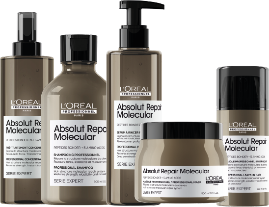Descubrimiento científico: Absolut Repair Molecular. Repara 2 años de daño en un solo uso. Por primera vez, la Investigación Avanzada de L’Oréal ha logrado descomponer los péptidos para inyectar sus componentes por separado en la fibra capilar. Una vez dentro, estos componentes se recomponen y reconstruyen la estructura molecular del cabello.
